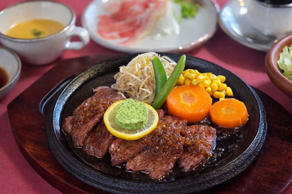 厚切りサガリにレモンステーキソースをかけて香草バターを添えました。醤油・レモン果汁・玉ねぎ等を使った甘酸っぱく爽やかなソースをお楽しみください!
